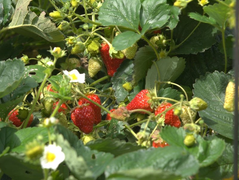 Nog steeds elke dag een flinke schaal aardbeien van de aardbeienheuvel. Ook nog vollop bloemen, dus het gaat waarschijnlijk nog wel een poosje door. We zijn geen van beiden dol op aardbeienjam, dus ik ben nog op zoek naar goede tips om de aardbeien mee te vermengen: pruimen? bramen?